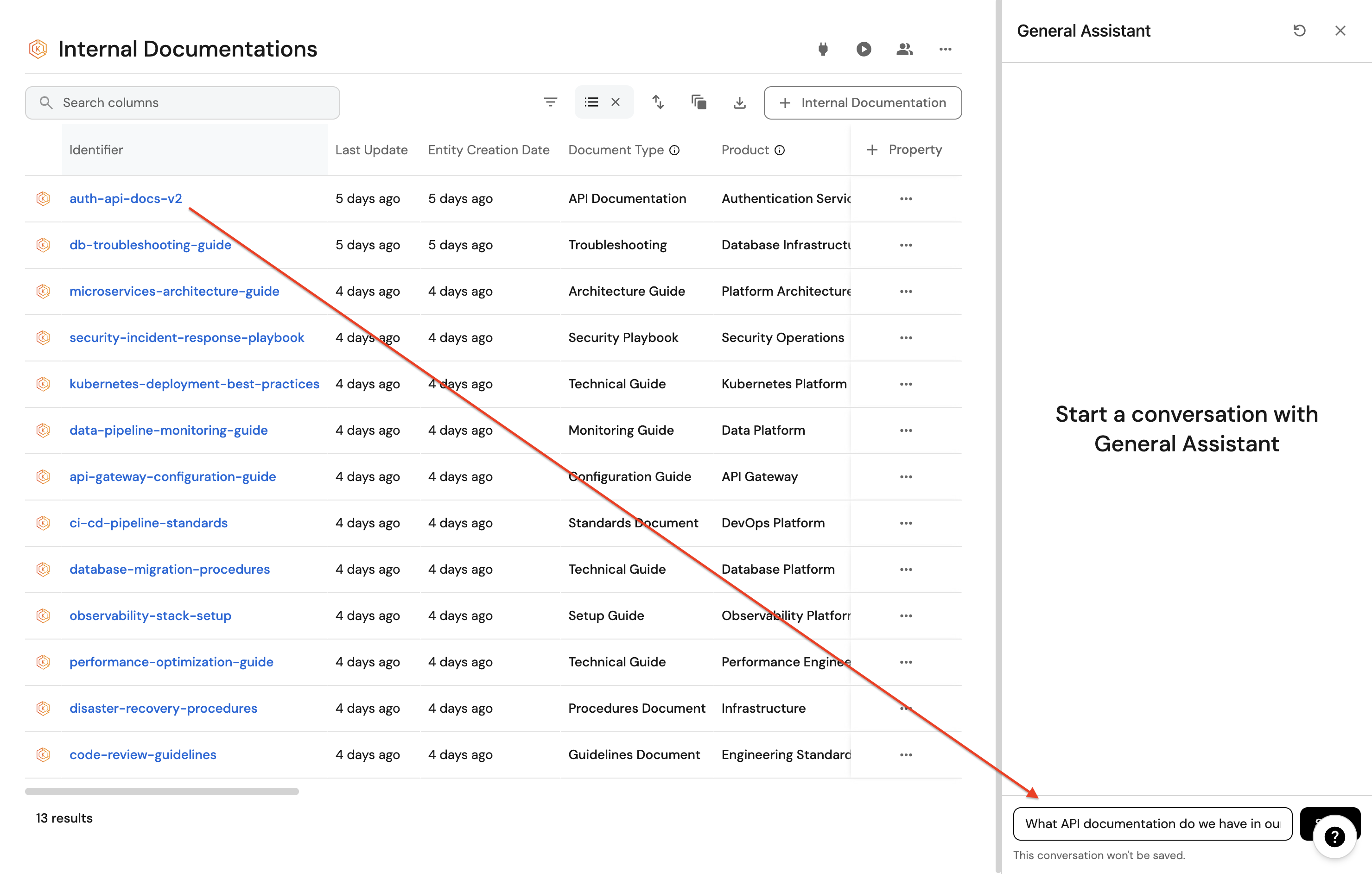 This guide demonstrates how to find internal documentation with AI. By storing documentation as entities, you can ask questions like "When was this document last updated?", "Who owns this document?", or "What are all the product-related docs?" and get intelligent responses.